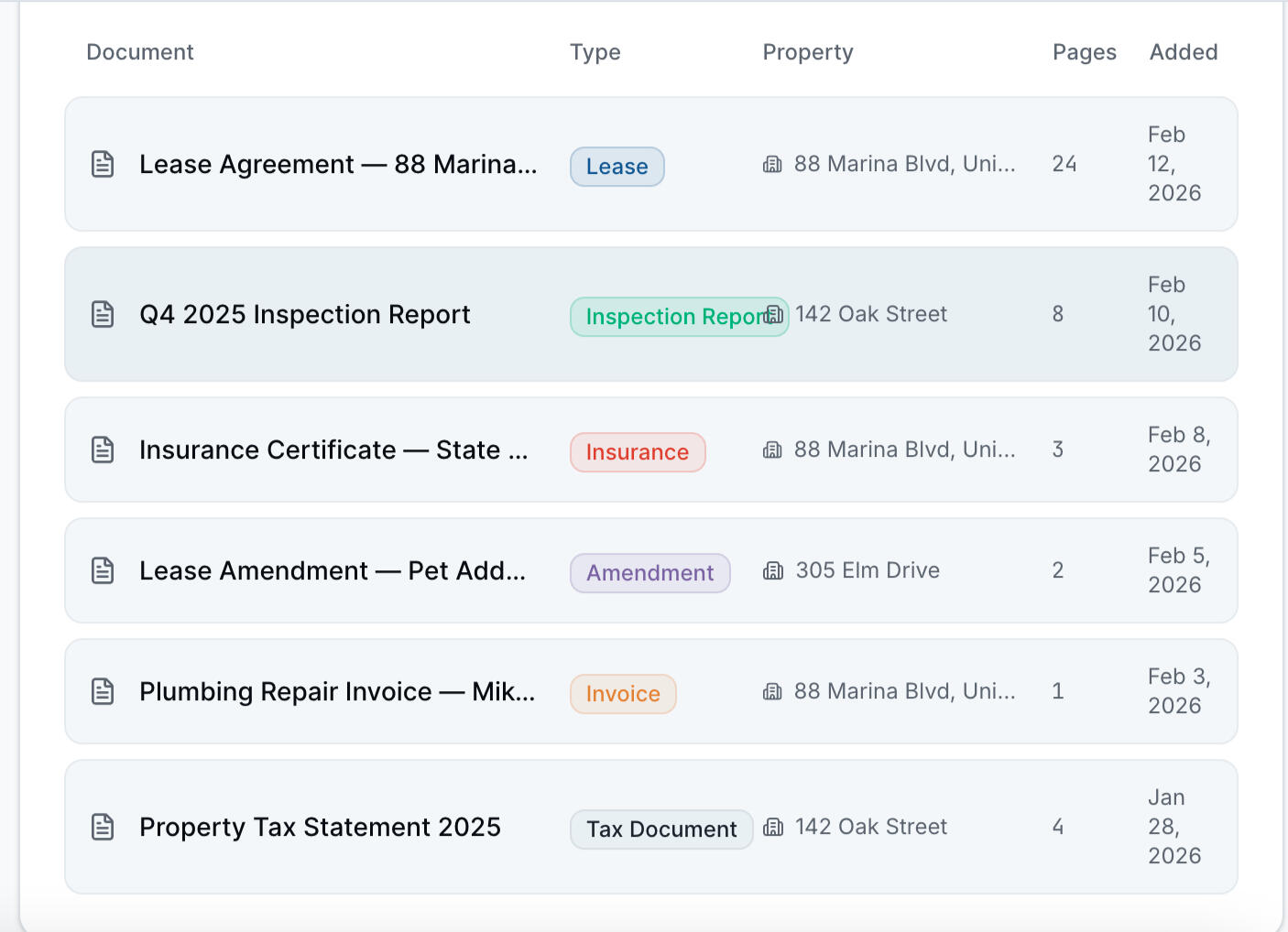 Leases, inspection reports, amendments — auto-classified and searchable in one place.