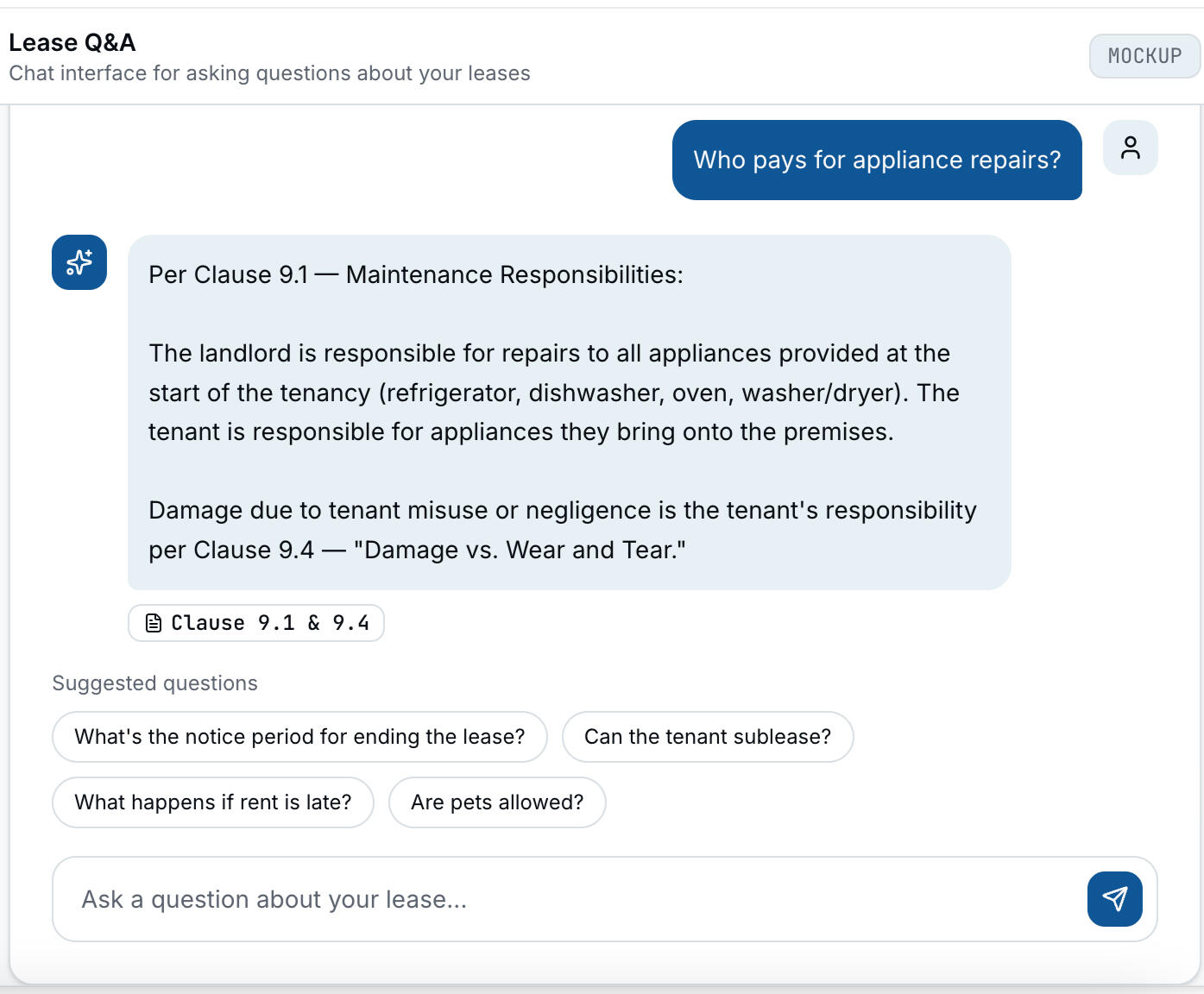 When can I enter for inspections?" "Who pays for appliance repairs?" "What's the notice period?" Upload your lease and ask questions in plain English. Instant answers from your actual document — not a generic FAQ.