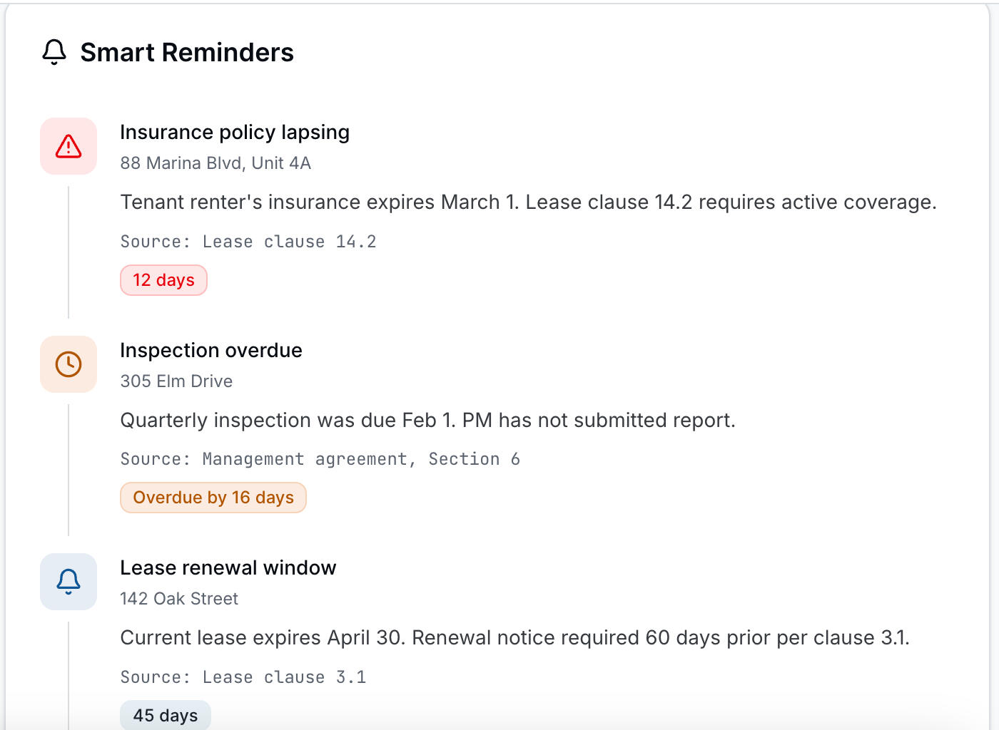 Most reminder apps make you set everything manually. This one reads your leases and does it for you. Inspection deadlines, lease expirations, rent increase windows, insurance renewals — all pulled from your actual documents. You get a heads-up before it's a problem, not after your PM forgot.
