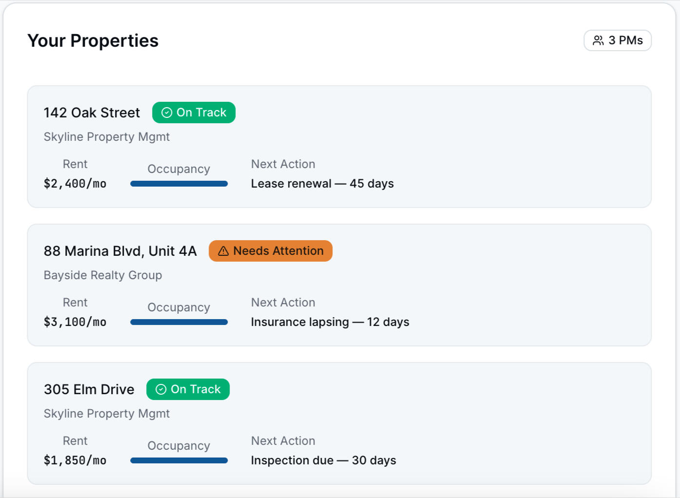 AI-powered oversight for landlords who use property managers. One single dashboard for every property, every PM, every document. Know what's happening without chasing your property manager for answers.
